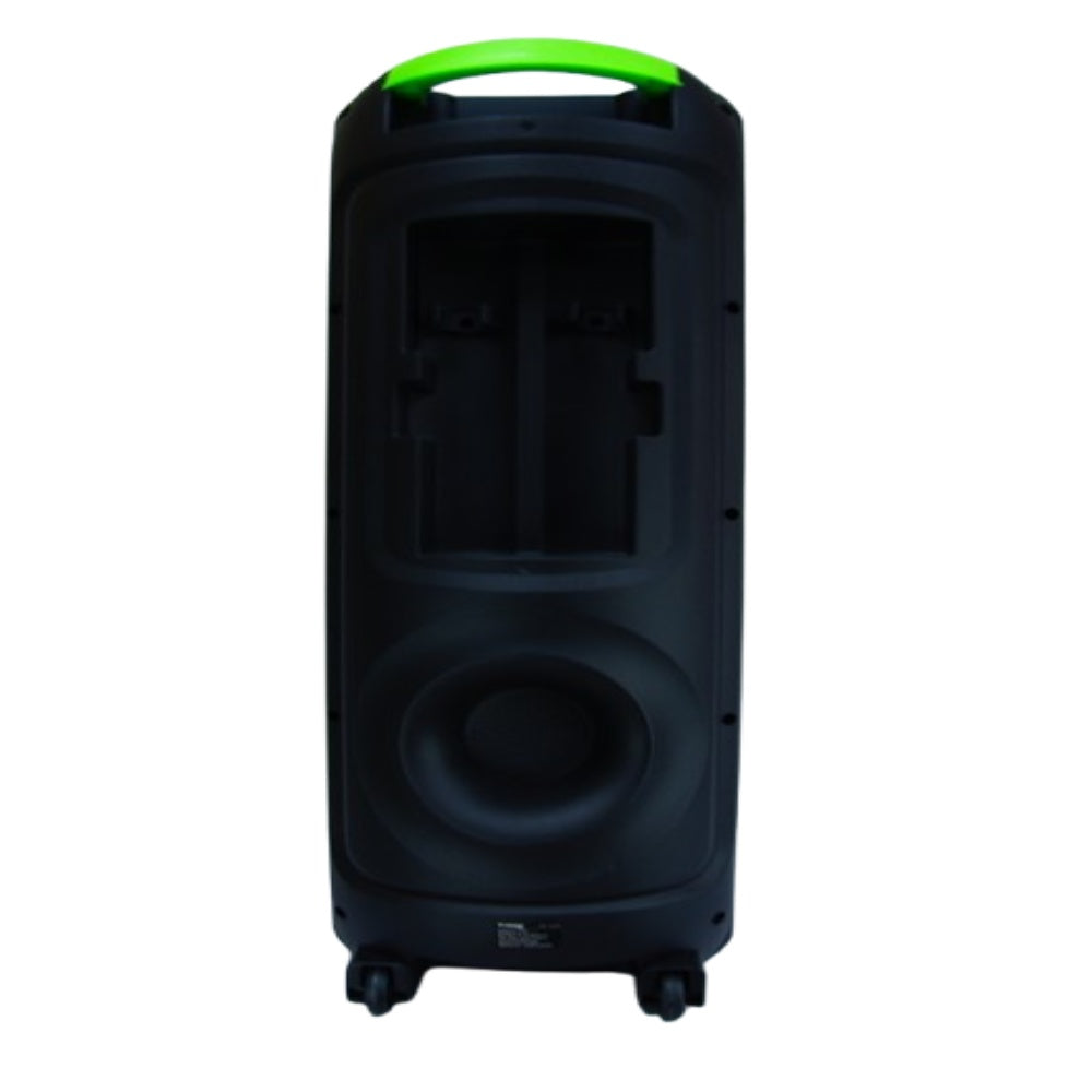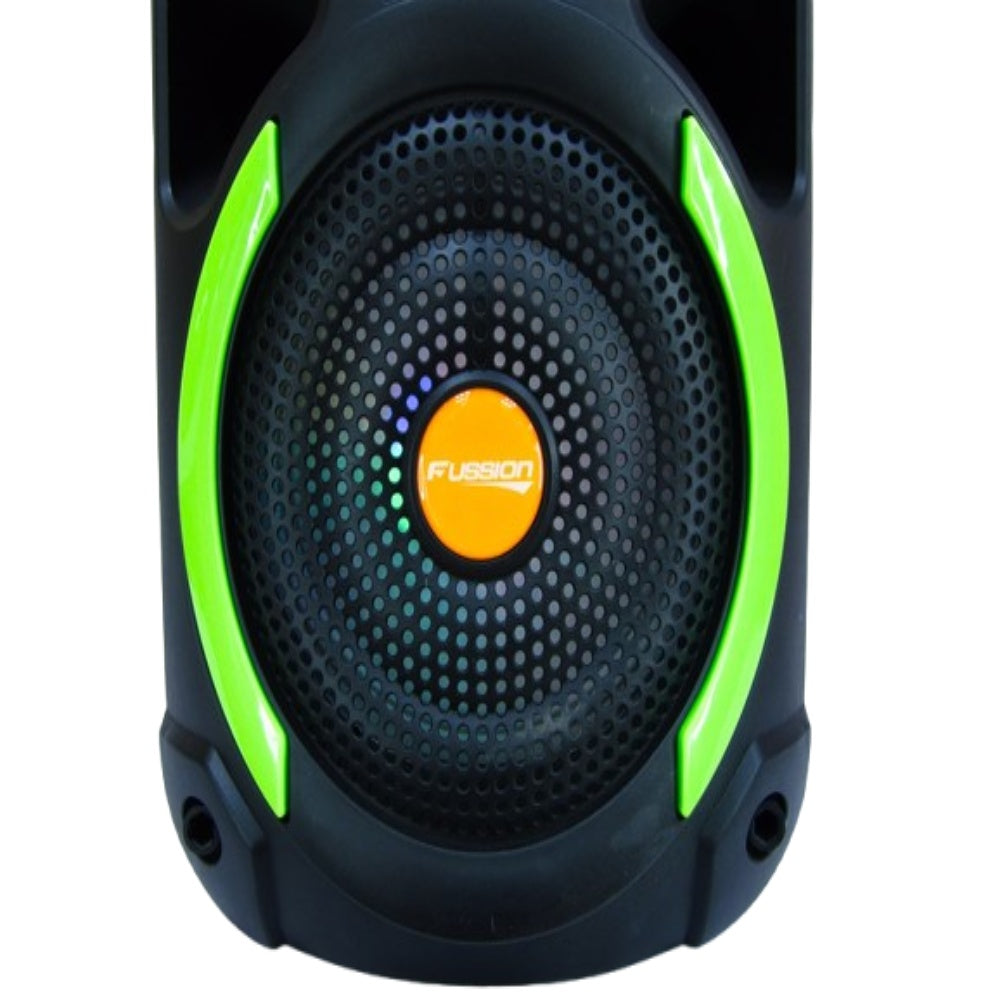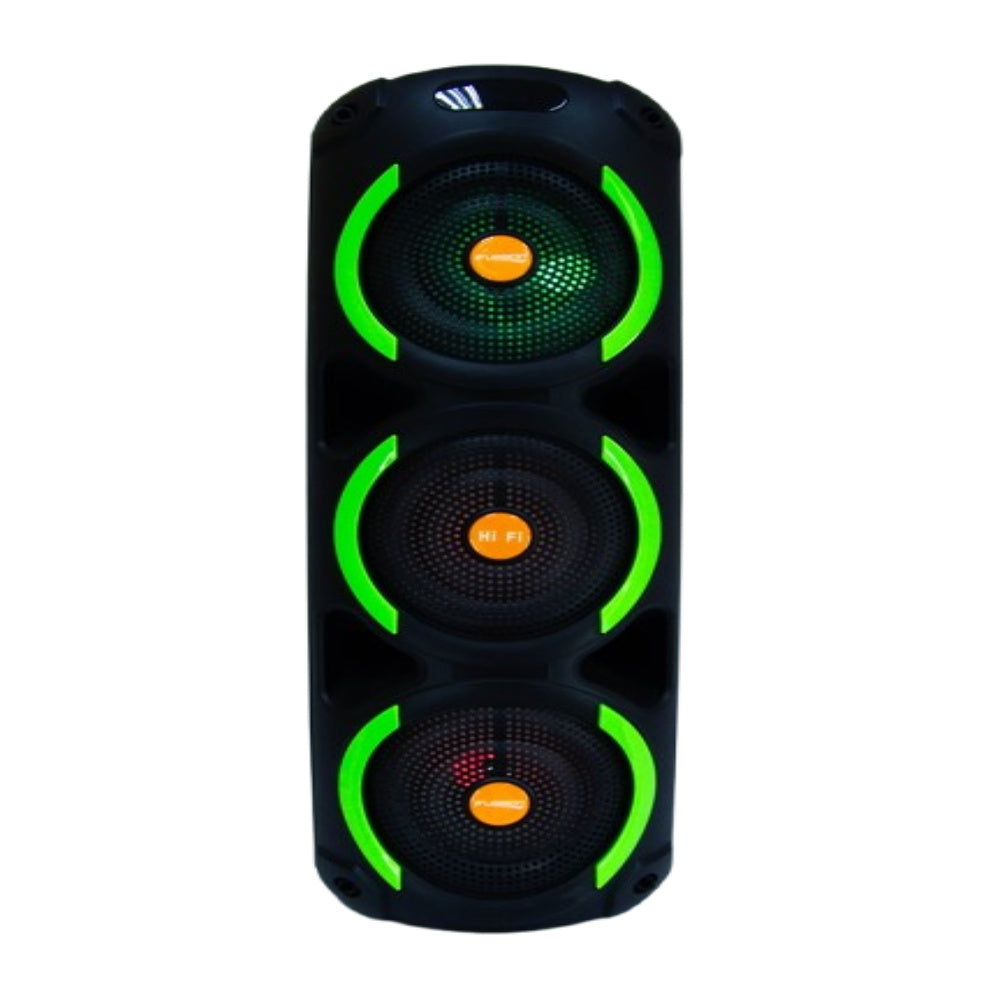 Fussion FR-6028 Radio Player - a powerful 30W portable trolley speaker designed for big sound and non-stop entertainment. Featuring three 8-inch full-range drivers, built-in RGB LED lights, and a high-capacity 3600mAh rechargeable battery, this speaker delivers crisp audio with vibrant visuals for up to 3 hours on a single charge.