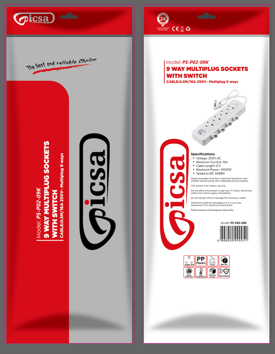 Picsa - 9 ways Independent multi plug sockets (White Color) - PS-P02-09K